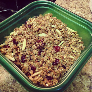 Once the granola mixture appears golden brown remove from oven and add craisins.